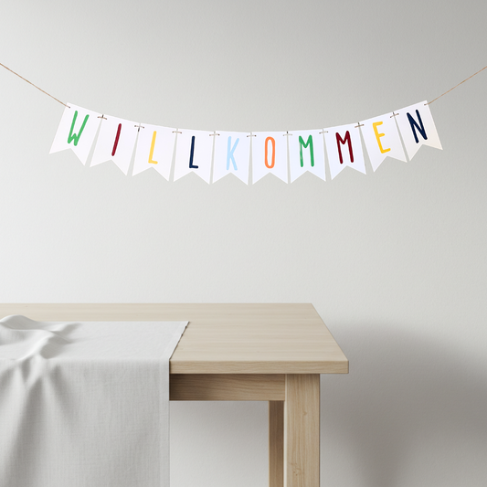 Wimpelkette "Willkommen" auf weißem Kraftpapierwimpel