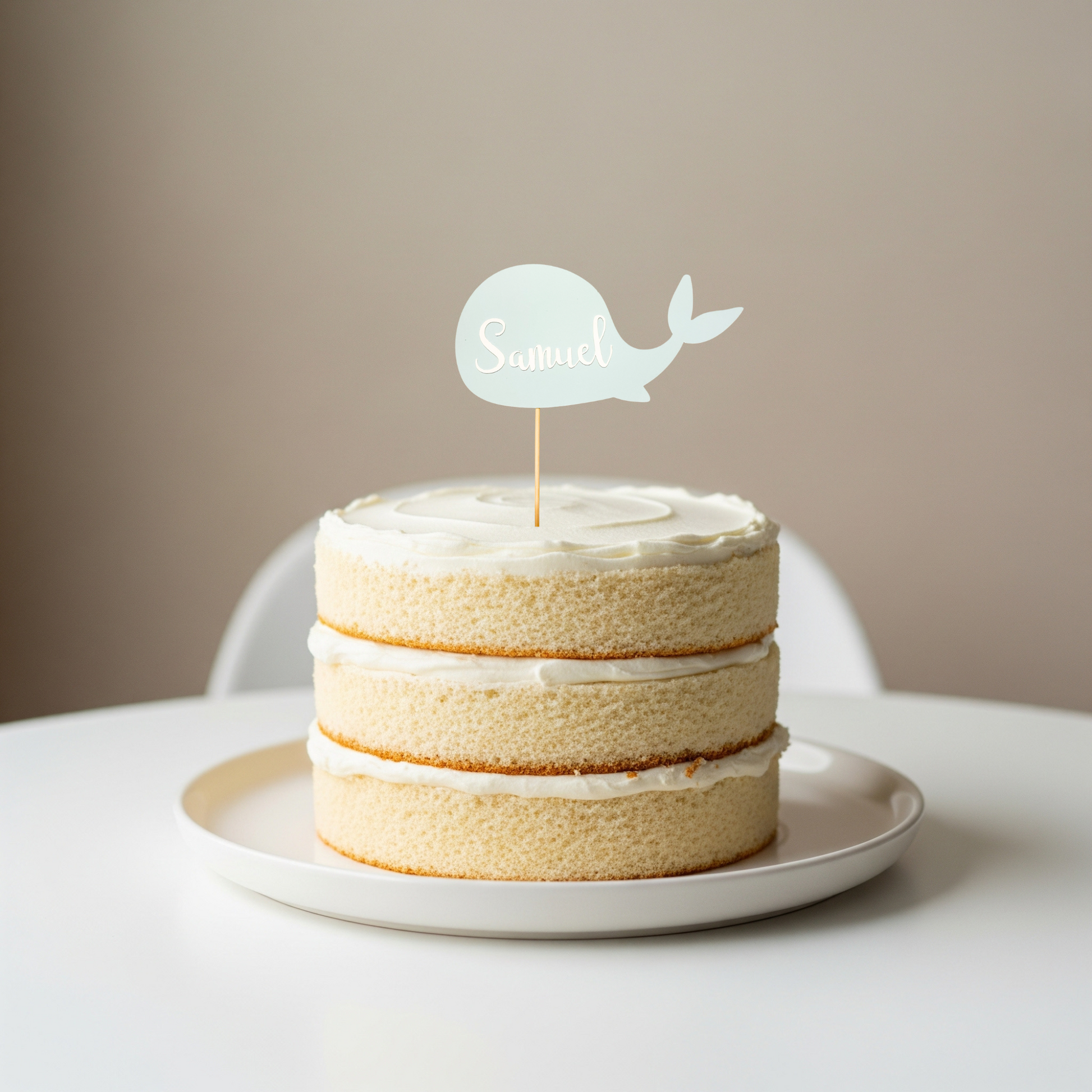 Mache deine Torte zum maritimen Hingucker! Dieser liebevoll gestaltete Kuchentopper in Walform, personalisiert mit deinem Wunschnamen, wird zum strahlenden Mittelpunkt auf jedem Kuchen.