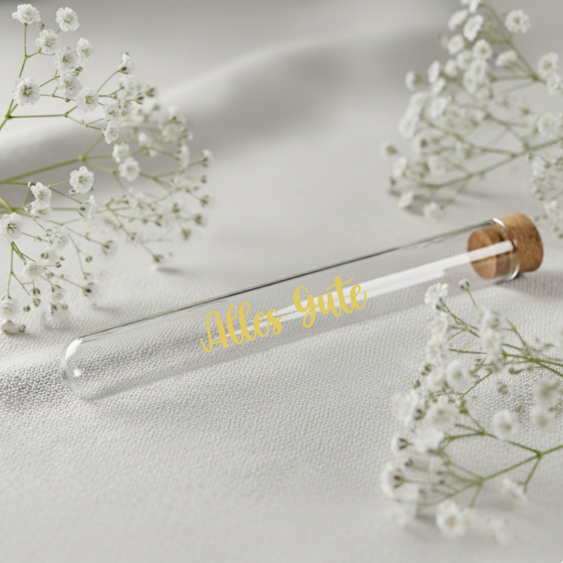Zudem kannst du die Schriftfarbe wählen, um sie perfekt an den Anlass oder den Geschmack des Beschenkten anzupassen. Ob als Geburtstagsgeschenk, Abschiedspräsent oder einfach als kleine Aufmerksamkeit für einen lieben Menschen – dieses Reagenzglas ist vielseitig einsetzbar und macht aus einem einfachen Geldgeschenk eine echte Herzensangelegenheit.